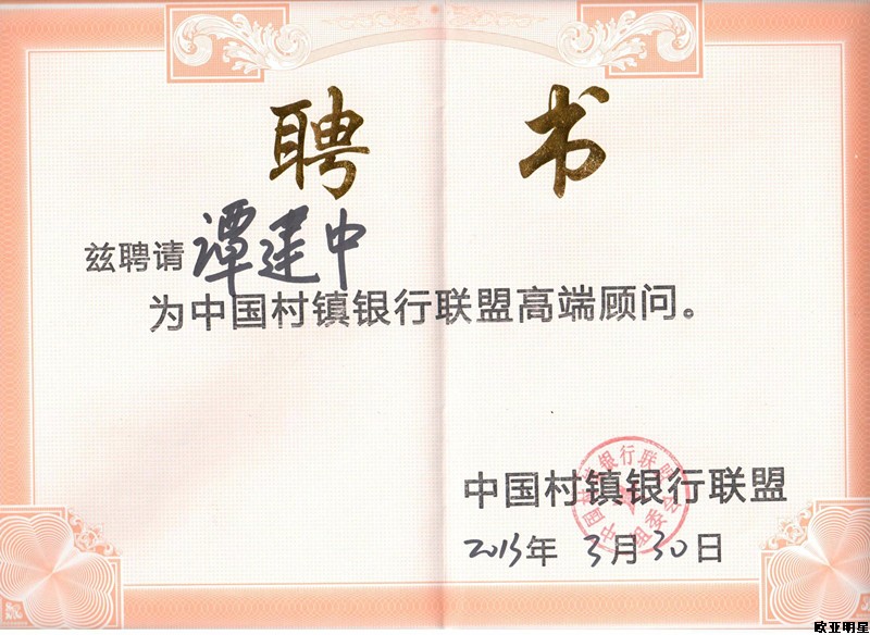 欧亚明星创始人谭建中受聘为中国村镇银行联盟高端顾问